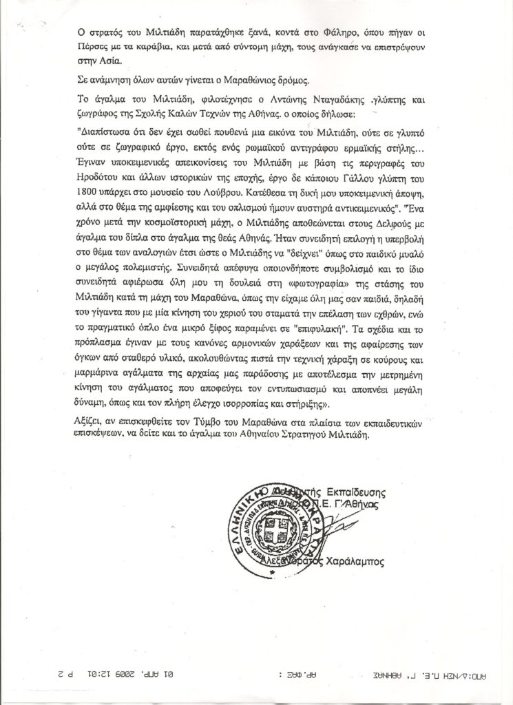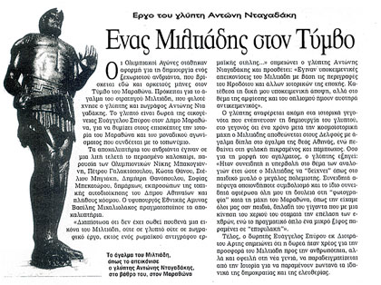 Με θαυμασμό και υπερηφάνεια, διάβασα στο έγκριτο περιοδικό σου την πρωτοβουλία που είχες για την προβολή προς τις επόμενες γενιές με ανάδειξη του στρατηγού Μιλτιάδη δια της ανύψωσης του ανδριάντα του εις την περιοχή του Μαραθώνος.