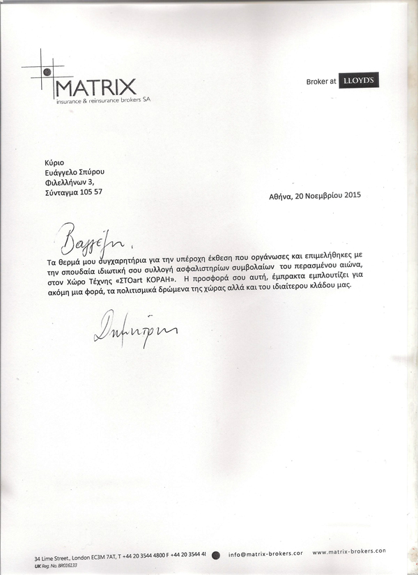 Αφού σας ευχαριστήσω για την προσωπική πρόσκλησή σας στο χώρο «ΤΕΧΝΗ» στη Στοά Κοραή, θα ήθελα να σας εκφράσω συγχαρητήρια για την ανάδειξη του πλούτου του κλάδου μας με ένα θαυμάσιο τρόπο σε μια αξιοπρεπή έκδοση. Κανένας δεν θα μπορούσε να φανταστεί ότι υπάρχει τέτοιος πλούτος και αν ακόμη το γνώριζε, δεν θα αναλάμβανε να κάνει μια τέτοια προβολή που άφησε έκπληκτους τους καλεσμένους σας, ιδιοκτήτες ασφαλιστικών εταιριών, την ηγεσία της Ένωσης Ασφαλιστικών Εταιριών , στελέχη εταιριών και διαμεσολαβούντες για την ιστορία του θεσμού με αδιάσειστα στοιχεία των τελευταίων 200 ετών.