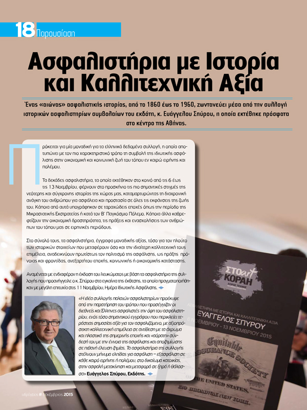 Μια πτυχή πολιτισμού. Μια διαφορετική εικόνα της ασφαλιστικής αγοράς. Κυρίως όμως, η κοινωνική διάσταση της εξέλιξής της, όπως αυτή αποτυπώνεται σε ένα ασφαλιστικό συμβόλαιο, αναδείχθηκε μέσα από την έκθεση της ιδιωτικής συλλογής του εκδότη κ. Ευ. Σπύρου με τίτλο «ΑΣΦΑΛΙΣΤΗΡΙΑ ΜΕ ΙΣΤΟΡΙΑ ΚΑΙ ΚΑΛΛΙΤΕΧΝΙΚΗ ΑΞΙΑ».